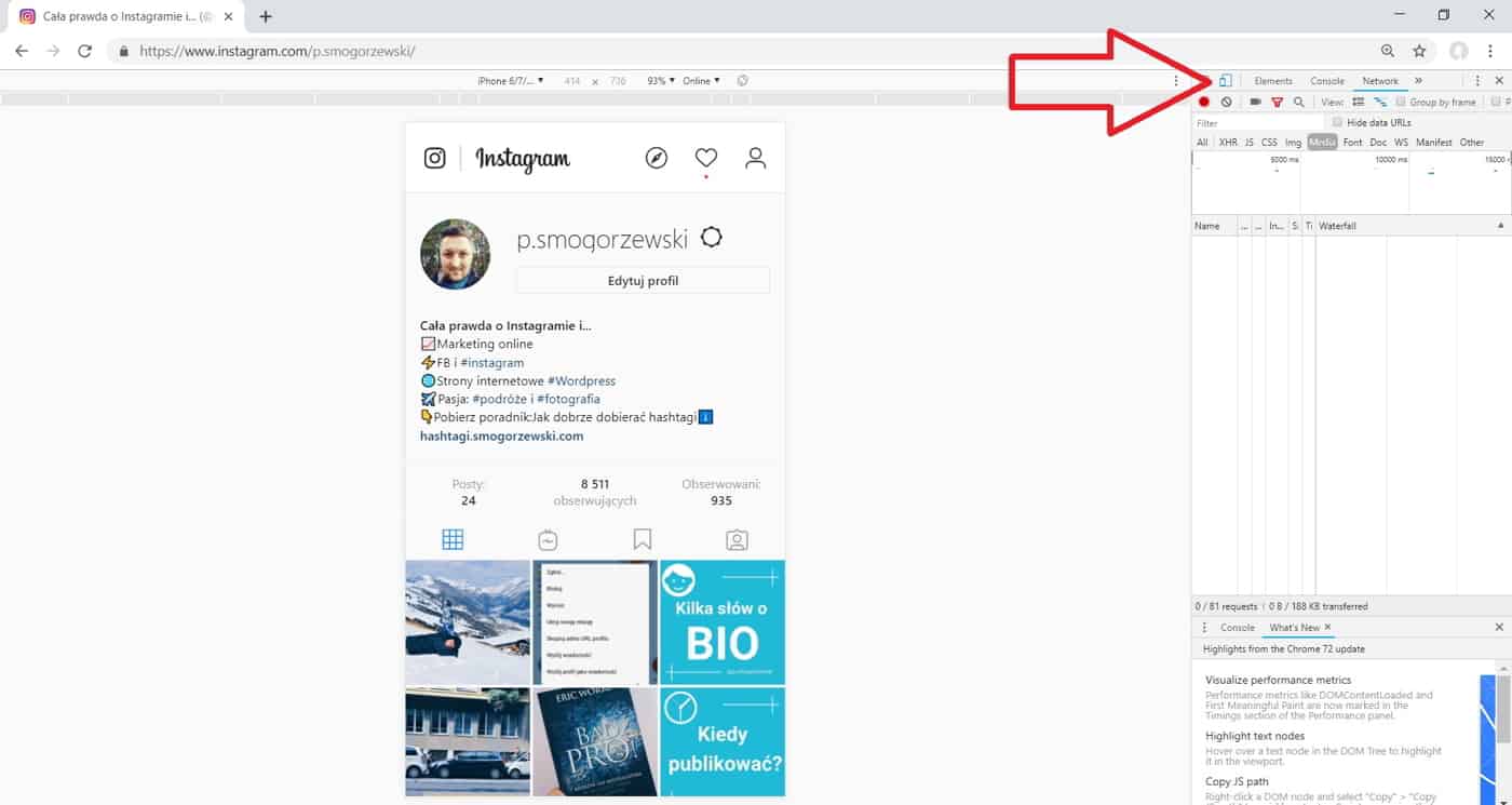 Teraz naciskamy przycisk tak jak pokazano to na poniższym zdjęciu lub korzystamy ze skrótu klawiszowego Ctrl + Shift + M. Dzięki temu zostaniemy przełączenie na widok dla urządzeń mobilnych.