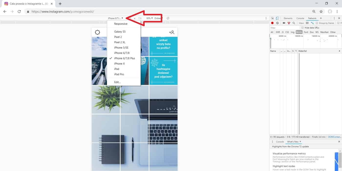 Po odświeżeniu strony pokażą nam się wszystkie opcje jakie mamy dostępne na naszym telefonie. Dzięki temu możemy dodać do naszego konta na Instagramie dowolne zdjęcie lub film z poziomu przeglądarki internetowej.