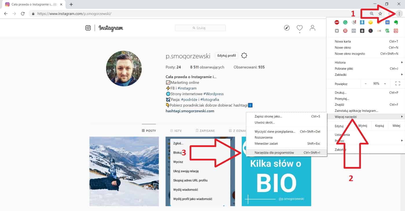 Pokażę Ci jak to zrobić za pomocą przeglądarki internetowej Chrome. Jeśli nie masz jej zainstalowanej to możesz ją pobrać tutaj -> LINK. Następnie przejdź na stronę Instagram.com i zaloguj się na własne konto. Następnie w górnym pasku przeglądarki kliknij kolejno Więcej narzędzi →  Narzędzia dla programistów lub korzystamy ze skrótu klawiszowego Ctrl + Shift + i